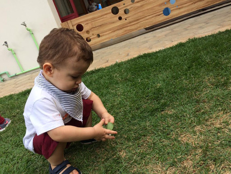Já em relação ao “green”, a turma fez uma pintura interessante, observando que a mistura “blue and yellow make green”! Pensando no espaço escolar, nada melhor do que explorar o gramado da escola – local onde o grupo adora brincar. As crianças foram convidadas a observarem os tons de verde do gramado e das folhas, além da oportunidade de sentirem a textura de ambos, tocando-os com as mãos e os pés. Saborearam também o brócolis, tornando o momento de “snack” ainda mais delicioso! Quanta diversão e aprendizado esta atividade agregou ao grupo!