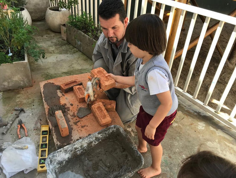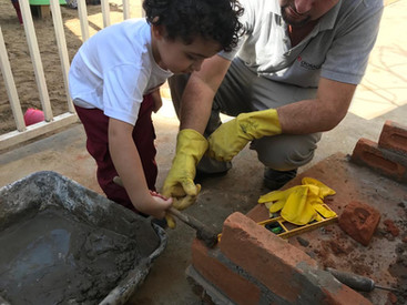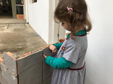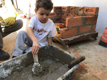 O desafio já apareceu em colocar as luvas para proteger as suas mãos até o entretenimento em vestir a caixa de azulejos que virou chapéu. Em seguida, auxiliar o Gilmar, trazendo água para encontrar a melhor consistência da massa de cimento. Esse foi um posto disputadíssimo: ajudante de pedreiro! Houve também algumas visitas técnicas para conferir a aderência dos azulejos ou a firmeza dos tijolos. Foram dias desafiadores e de muita construção, literalmente.