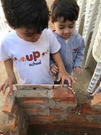 Para iniciar a fazer a parede, houve uma exploração primorosa dos materiais, em que texturas, pesos, cores, cheiros e mesmo os sons dos seus manuseios revelaram o entusiasmo, o engajamento e os olhos curiosos das crianças a novas possibilidades de criar – de produzir uma casa, facilmente associada aos tijolos. O tijolo era autoexplicativo, não foi necessário oferecer grandes instruções ao que iam produzir.