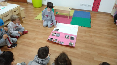 Em linguagem, o uP4 tem nos impressionado com seu desenvolvimento. Trabalhamos com eles as vogais E e I (grafia e som). Notamos que eles têm se desenvolvido muito, já que passaram a nos fazer perguntas sobre os sons das palavras, como: “Com qual letra começa a palavra?”, “Como escreve essa palavra?”, “Mas essa palavra não escreve com E?”. Essas perguntas são provas de que eles estão refletindo sobre o que estão aprendendo, e estão prestando atenção nas palavras que os rodeiam e que fazem sentido para eles. Além disso, percebemos que estão buscando cada vez mais atividades que envolvam letras para os momentos de “working period”.