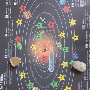 Nosso Solar System Booklet, que está sendo confeccionado e escrito com muito capricho a partir de discussões e vídeos sobre cada um dos planetas. As crianças se divertiram com um jogo de tabuleiro, onde o objetivo principal era passar por dificuldades existentes em cada planeta, enfrentar cometas e até meteoros para conseguir voltar à terra. Em grupos, reproduziram o sistema solar utillizando massinha.